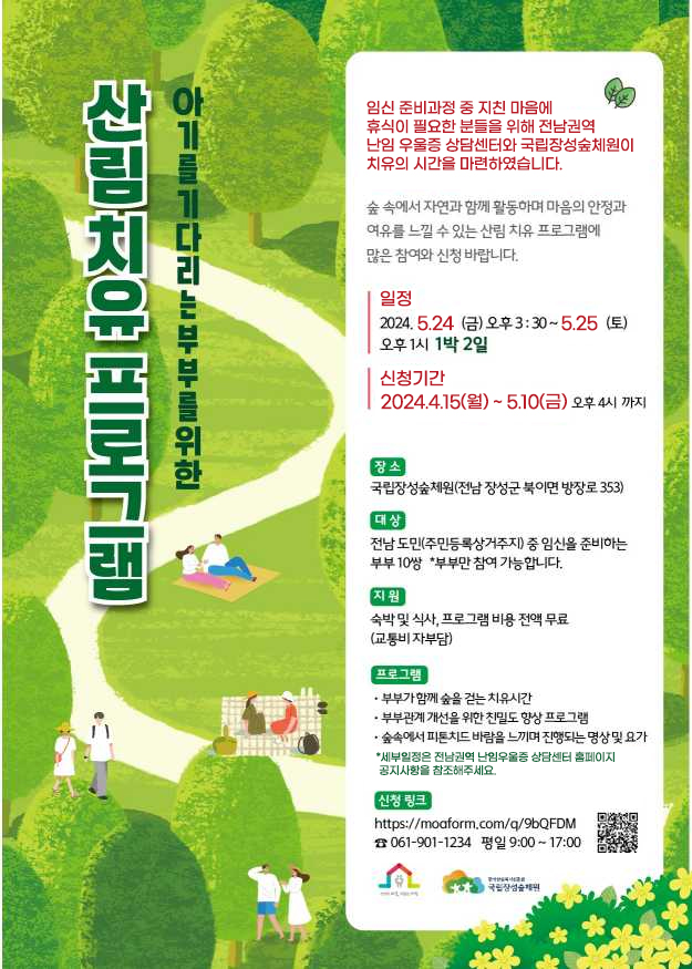 2024년 5월 24일부터 25일까지 1박 2일 동안 국립장성숲체원에서 펼쳐지는 이번 산림치유 프로그램은 전남도민 중 임신을 준비하는 부부 10쌍을 대상으로 합니다. 참여 부부는 숙박 및 식사, 프로그램 비용 전액을 무료로 지원받으며, 교통비만 자부담해야 합니다.