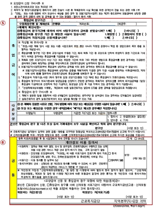 상기의 "⑤휴업급여 신청 내역"에 관련된 내용은 허위나 추정 없이 사실에 입각하여 기입하여야 하며, 만약 근로자가 허위나 추정으로 산재신청서를 제출한 후 공단으로부터 휴업급여를 지급받았다면 지급받은 휴업급여의 2배에 상당하는 금액을 공단에 납부해야 할 수 있습니다.