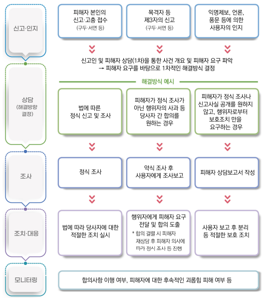 직장 내 괴롭힘 사건 접수 시 신속하게 처리하되 피해자의 의사에 따라 상담을 통한 고충처리 단계에서 당사자 간 해결을 먼저 모색한 후 정식 조사절차로 돌입할 수 있음