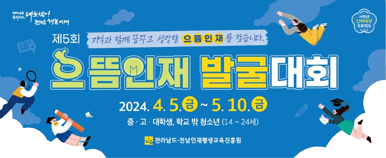 "인재는 전남의 희망입니다!"라는 슬로건 아래, 전라남도는 다양한 분야의 재능 있는 청소년들을 발굴하기 위해 「제5회 으뜸인재 발굴대회」를 개최합니다. 이 대회는 전라남도를 대표하는 인재로 성장할 수 있는 든든한 발판을 마련해 주기 위한 것입니다. 전남인재평생교육진흥원에서 주최하는 이 대회는 중·고·대학생 및 학교 밖 청소년을 대상으로 하며, 미래 사회를 이끌어 갈 으뜸인재를 발굴하고 지원합니다.
