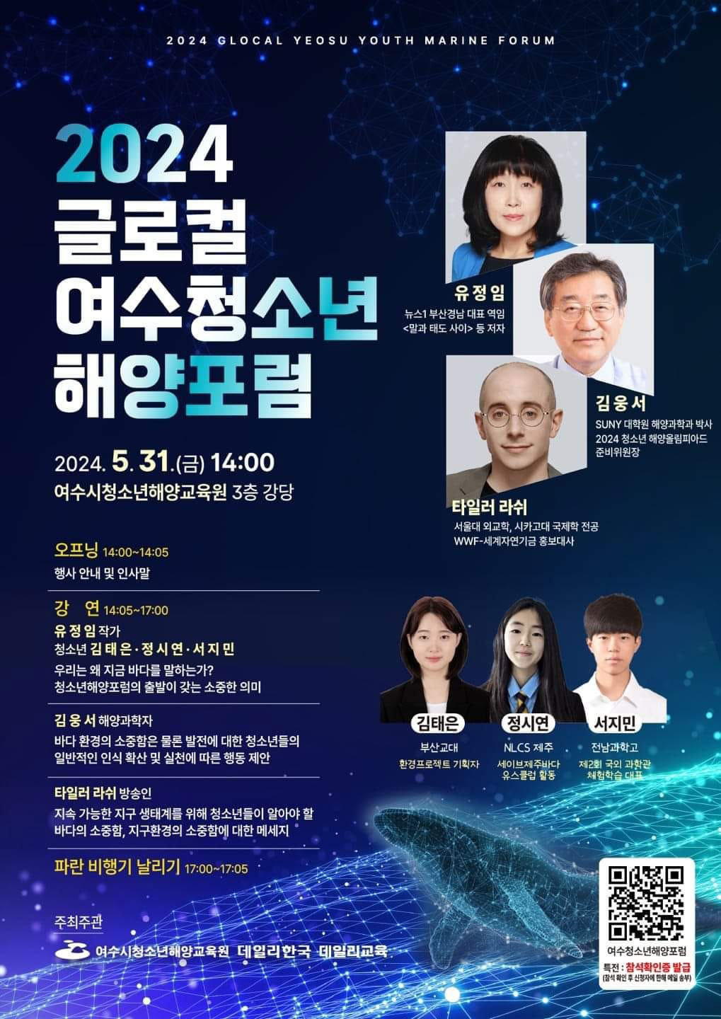또한 청소년 참여자들의 발표와 함께 해양과학자, 방송인 등 다양한 분야의 전문가들이 참여하여 해양 환경 보호와 지속가능한 발전을 위한 실천적 방안을 모색할 예정입니다.