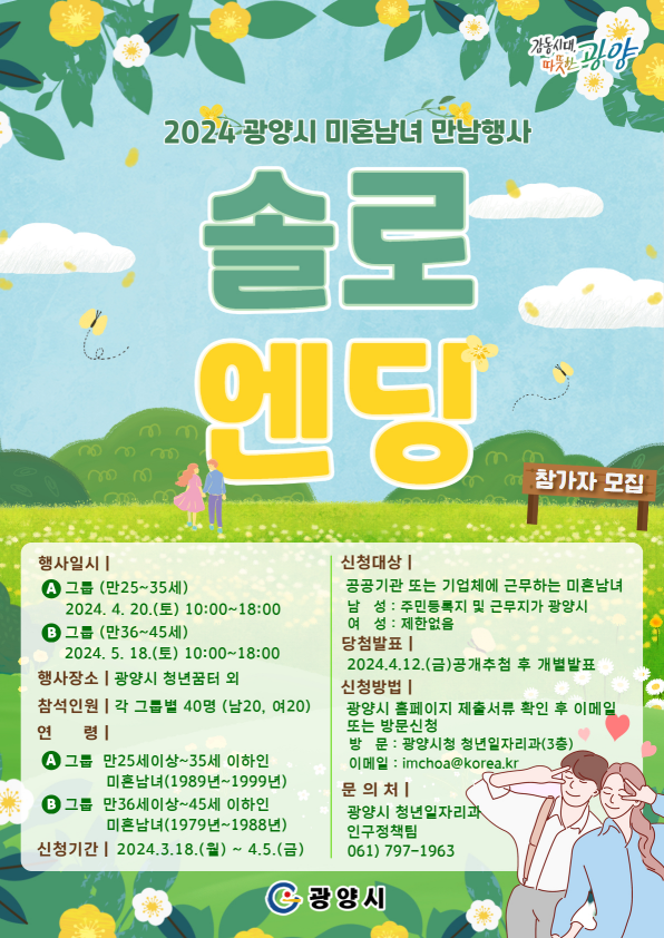광양시가 바쁜 일상 속에서 이성과의 만남 기회를 찾기 어려운 미혼 남녀를 위해 '광양 솔로엔딩' 행사를 개최합니다. 이번 행사는 4월 20일과 5월 18일에 각각 A그룹과 B그룹으로 나누어 진행되며, 각 그룹별로 남녀 20명씩 총 80명의 참가자를 모집할 예정입니다.