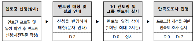 - 멘토링 매칭 : 현직에 종사하는 청년 멘토의 상황을 반영하여 멘토링 가능 일자 조사 후, 멘티가 희망 멘토를 선택하는 방식으로 매칭(선착순)