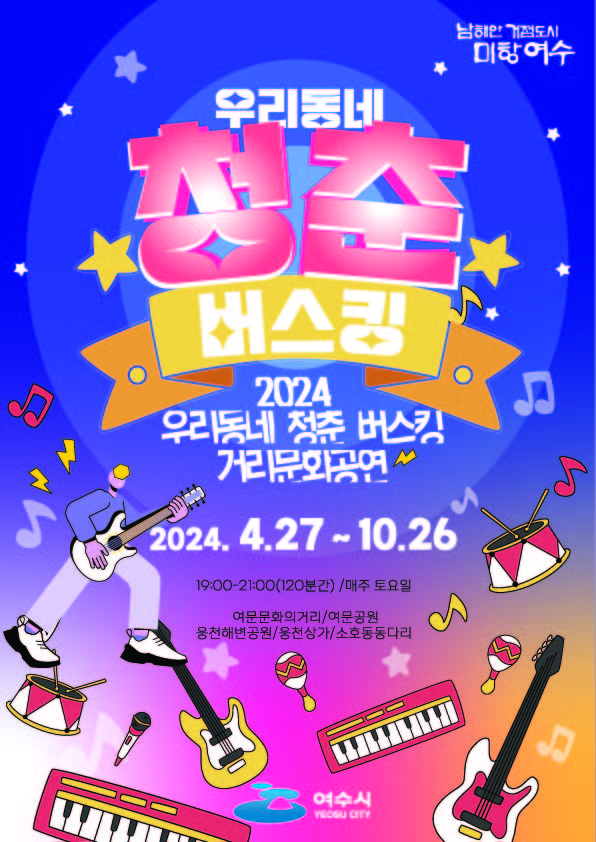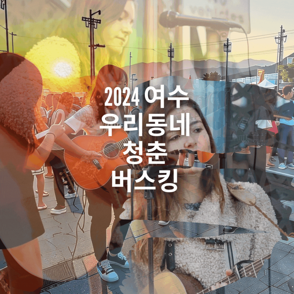 안녕하세요, 여러분! 여수의 아름다운 밤하늘 아래, 청춘의 열정과 낭만이 가득한 '2024 우리동네 청춘 버스킹'이 여러분을 찾아옵니다. 이번 버스킹은 2024년 4월 26일부터 10월 26일까지 매주 토요일 저녁 7시부터 9시까지 진행됩니다. 27주간 이어지는 이 특별한 공연에서 여수의 다양한 매력을 만끽해보세요.