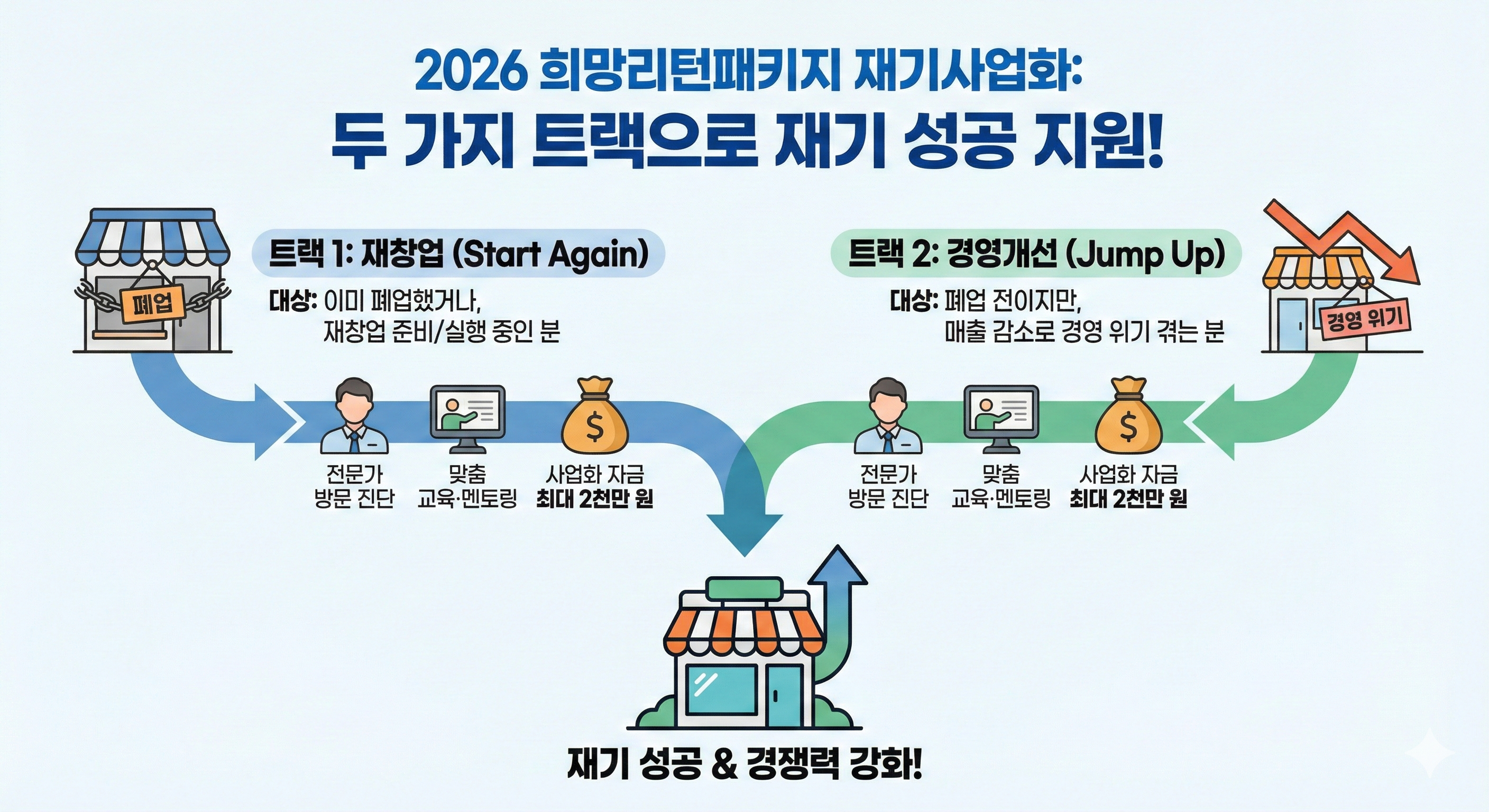 두 사업 모두 전문가가 직접 방문해서 사업장을 진단해주고, 이를 바탕으로 교육과 멘토링, 그리고 가장 중요한 사업화 자금(국비 최대 2천만 원)을 지원하여 재기를 돕는 것이 목적입니다.