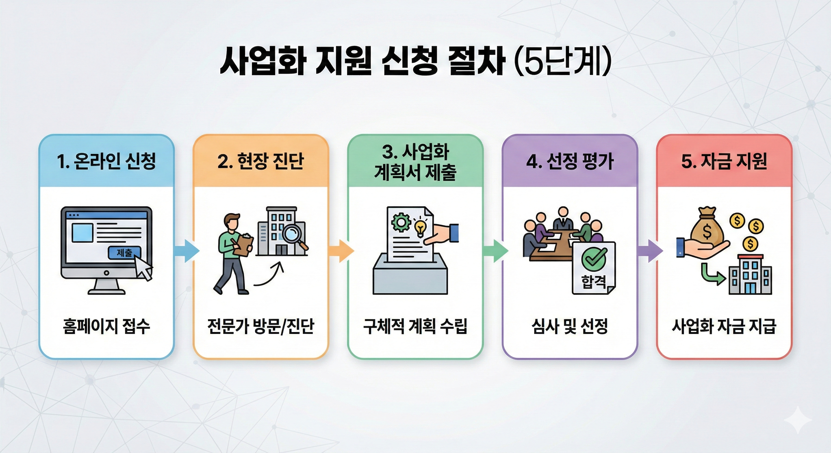 - 사업화 계획서가 관건: 진단 후 '사업화 대상'으로 선정되려면 발표 평가를 통과해야 합니다. 이때 '진단 결과 나온 취약점을 어떻게 개선할 것인가'를 계획서에 잘 녹여내는 것이 합격의 지름길입니다.